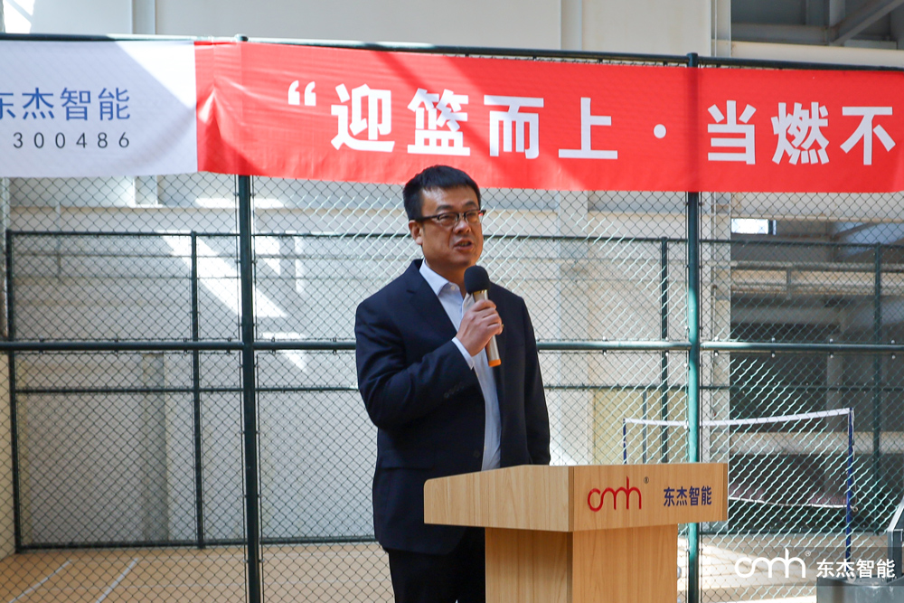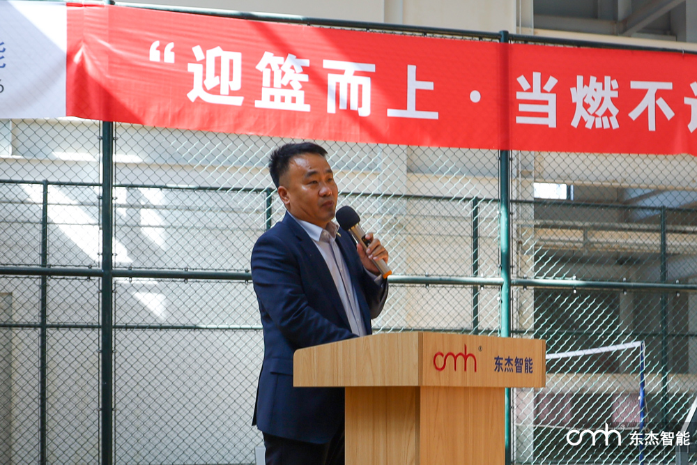 王总在随后的讲话中满怀激情地讲到:“迎篮而上·当燃不让”这八个字,生动诠释了我们东杰人敢打敢拼、追求卓越的精神。篮球场上的每一次进攻都需要五个人齐心协力,企业发展同样需要各部门紧密配合、携手并进。希望参赛队员们在比赛中展现出的激情与斗志,能够转化为工作中的创新动力和协作意识。"王总特别强调,"东杰智能始终致力于为员工打造实现价值的舞台,未来我们将继续完善人才培养机制,通过丰富多彩的文体活动和职业发展通道,让每一位员工都能在这里收获成长、成就梦想。"